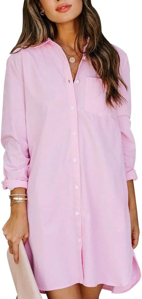 Women's Casual Loose Fit Long Sleeve Solid Striped Button Down Shirts Dresses
